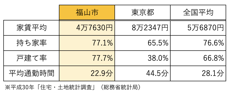 東京はもちろん全国平均と比べても家賃が安く、支出を抑えることができます。また、持ち家率が高く、ゆったりとした広さの一戸建てでの暮らしも夢ではありません。