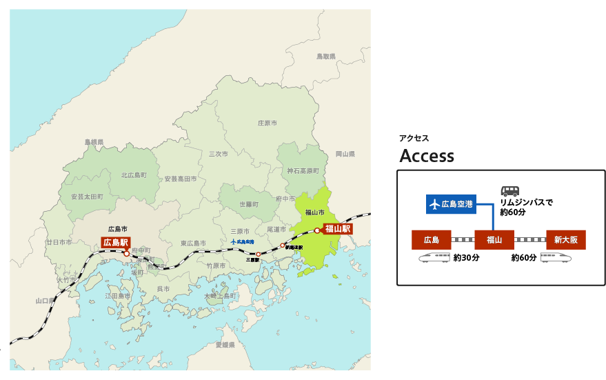 JR福山駅には新幹線「のぞみ」や「さくら」も停車するので、東京・大阪方面や福岡方面へのお出かけにも便利。広島空港にもバスで約60分で行けるほか、岡山空港を使うこともできます。